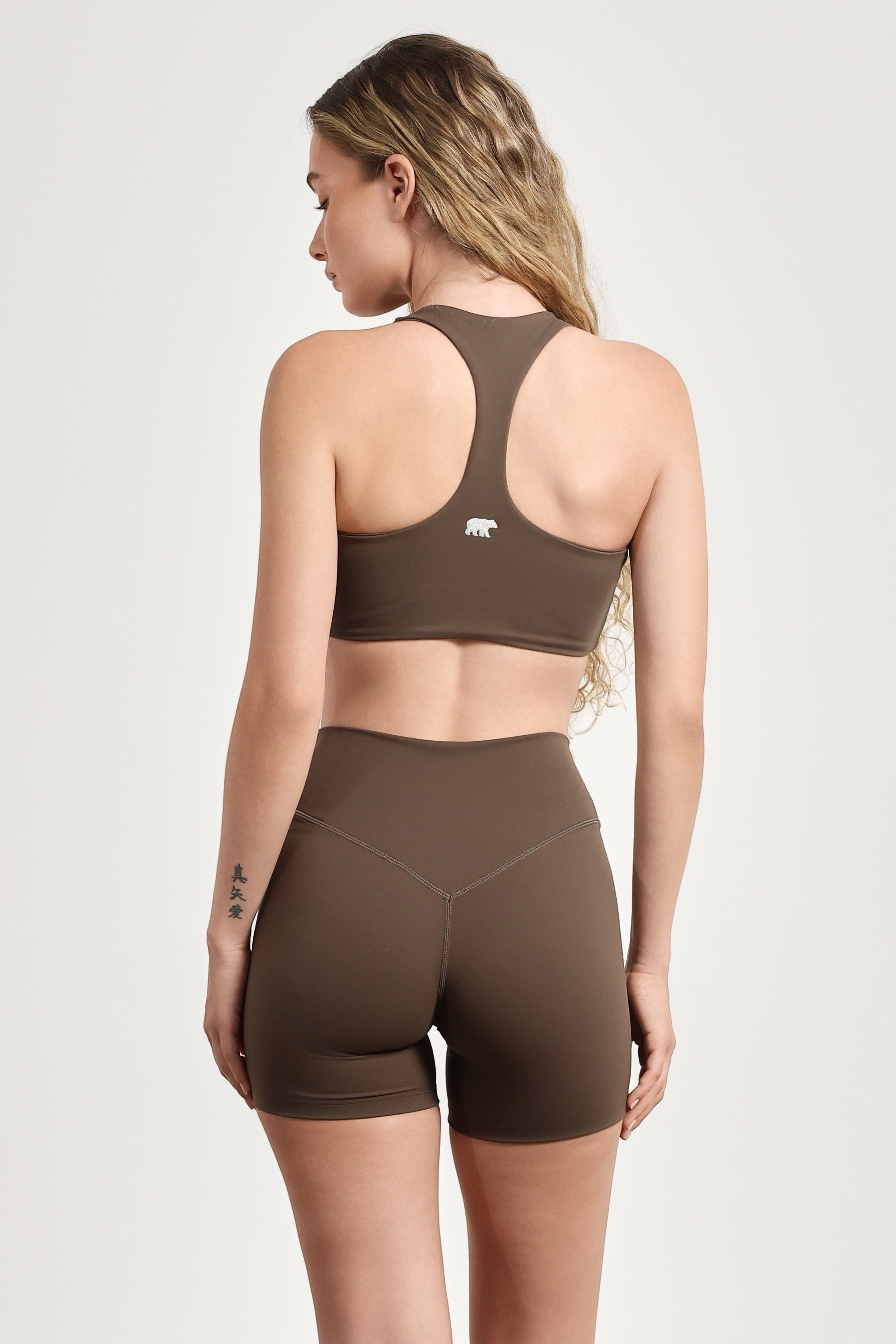 טייץ קצר בגוון חום בגזרה גבוה ומחטבת, עשוי מבד גמיש, נושם ועמיד במיוחד.